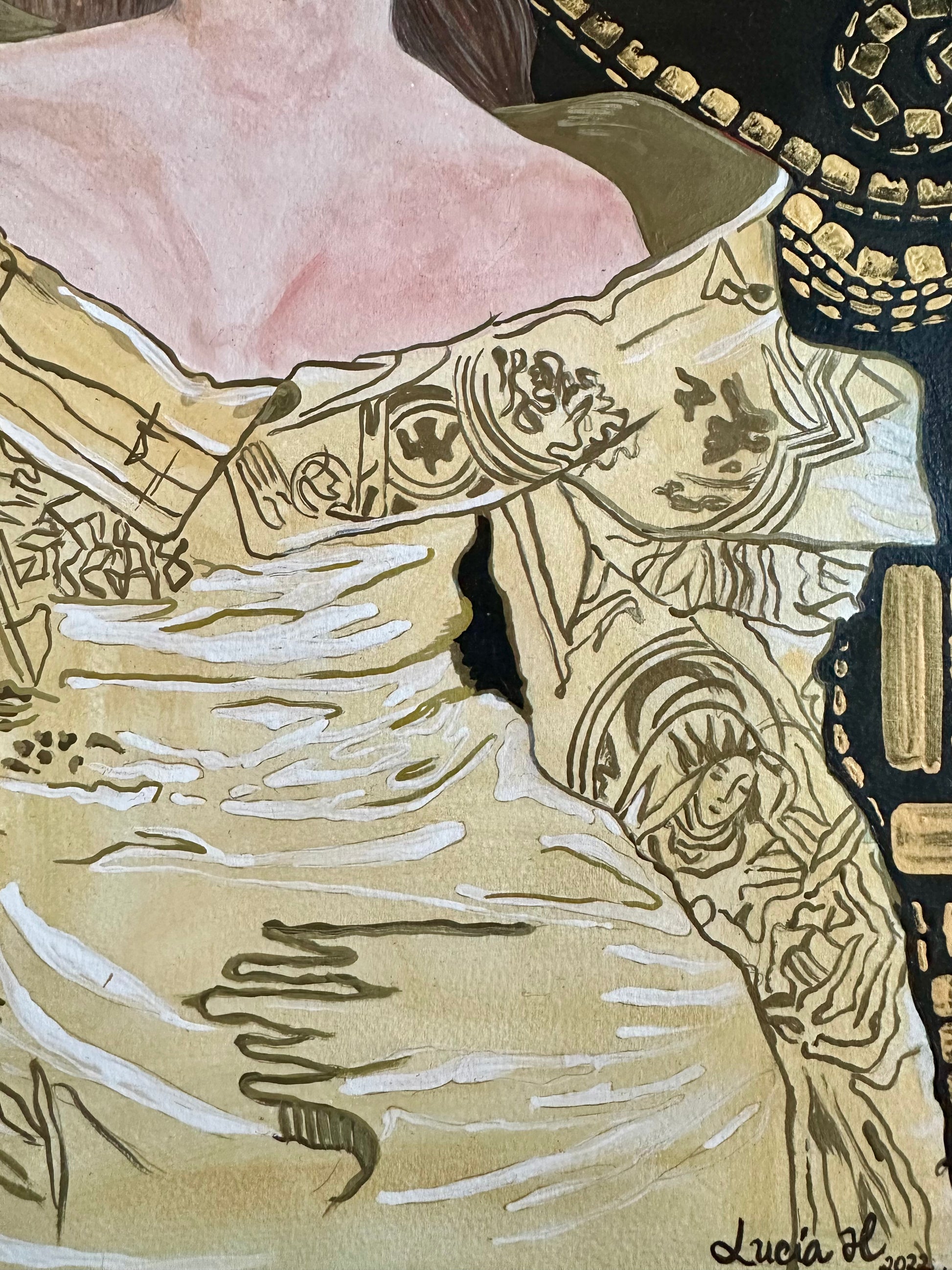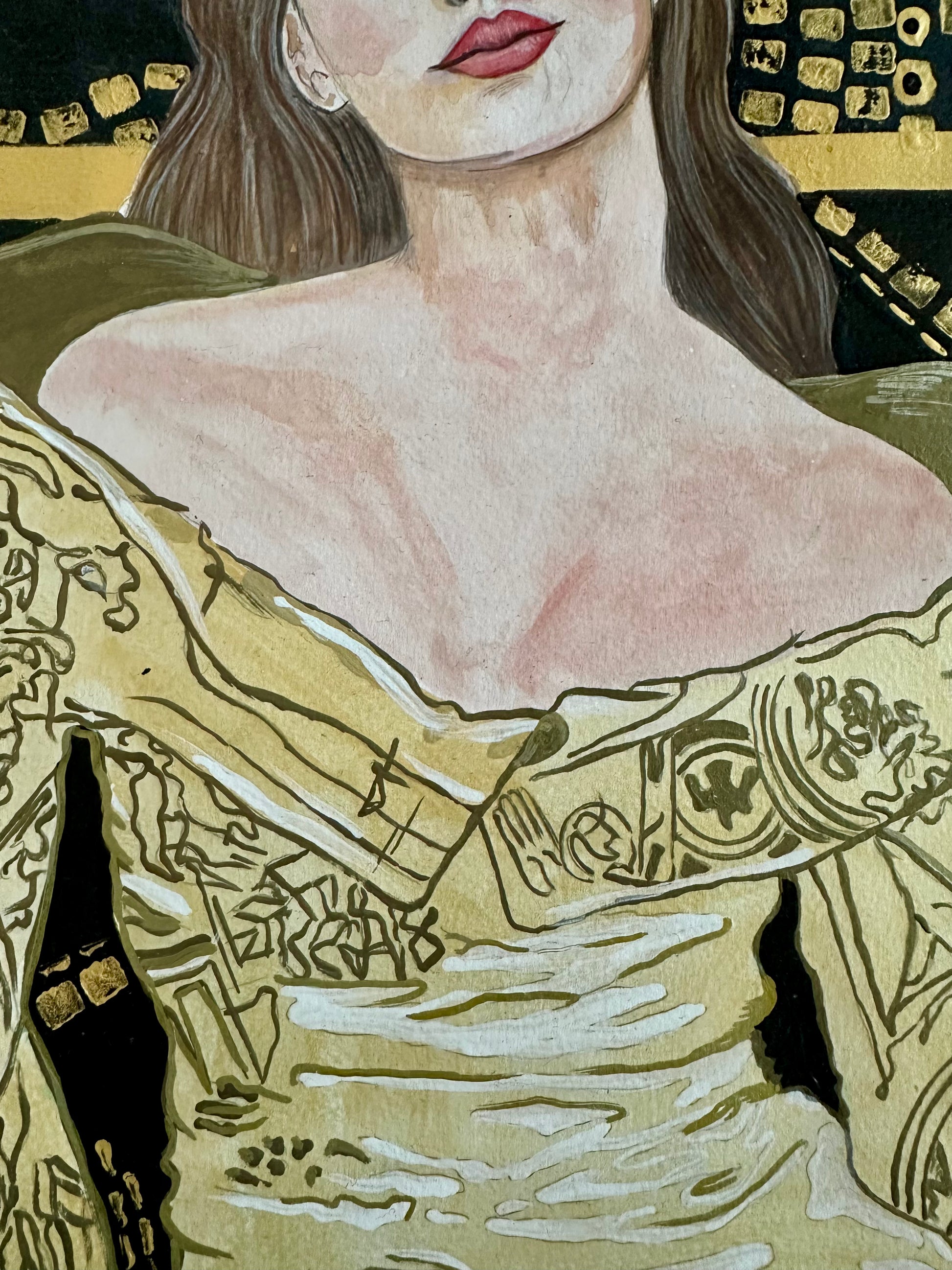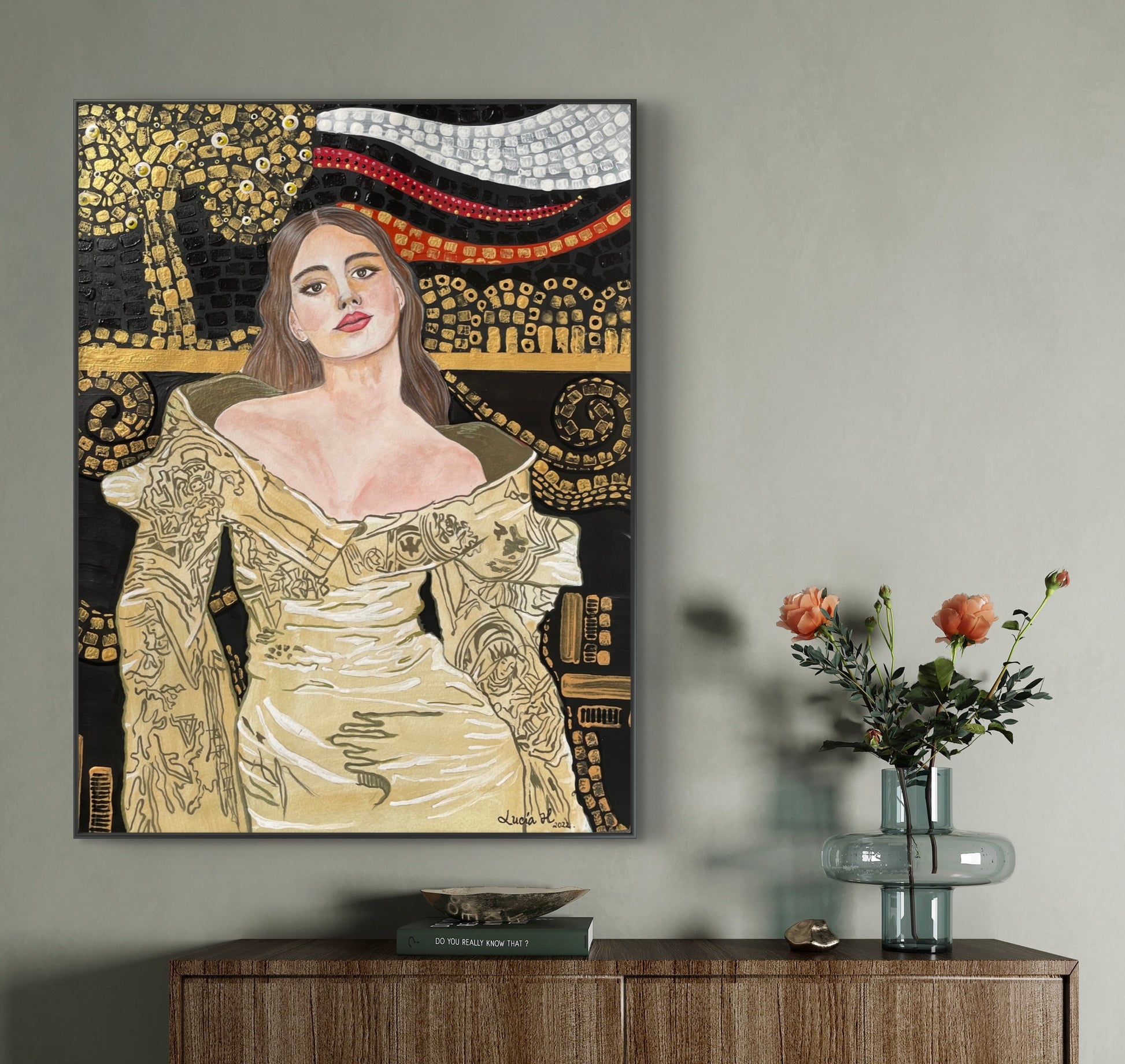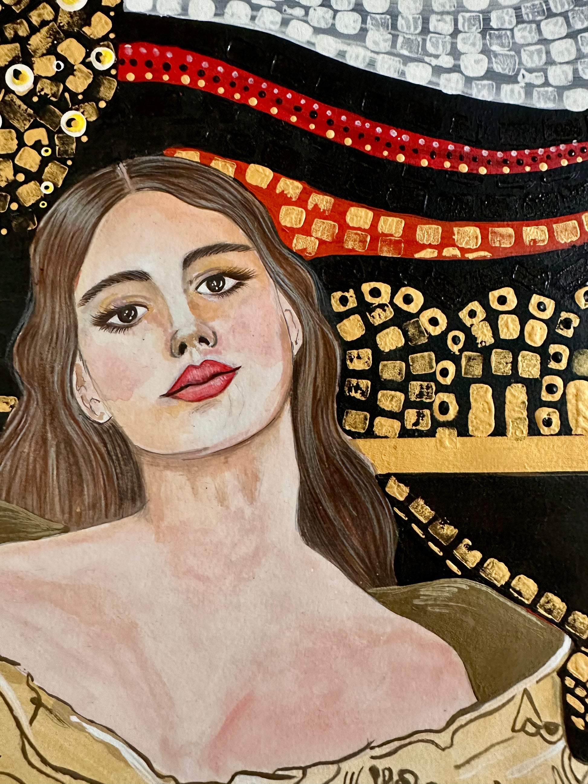 In this piece, golden light embraces a figure who seems to walk between dreams and realities. Luna is my tribute to the Moon Goddess, keeper of secrets, bearer of beauty, and symbol of quiet strength. Inspired by the rich ornamentation of Gustav Klimt and the intense gaze of eternal muses, this work blends radiant golds, intricate patterns, and a feminine presence that seems to glow from within.